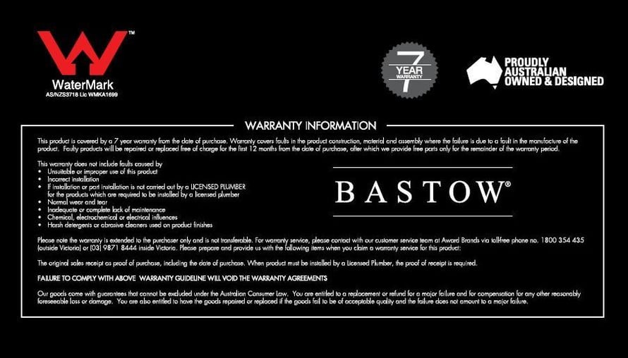 Bastows’ strict adherence to quality system guidelines guarantees the outstanding quality and reliability of its products. Bastow tapware and accessories are guaranteed against faulty workmanship and/or materials for seven years. Furthermore, our tapware complies to Watermark (AS/NZS 3718) and WELS ensuring the best possible quality product and peace of mind.