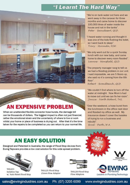 Designed and Patented in Australia, the range of Flood Stop devices from Ewing Tapware provides a low cost solution for this wide spread problem.